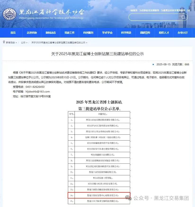 黑龍江省科學(xué)技術(shù)協(xié)會、黑龍江省工商業(yè)聯(lián)合會、共青團黑龍江省委員會聯(lián)合發(fā)布通知,公布2025年黑龍江省博士創(chuàng)新站第三批建站單位名單。黑龍江股權(quán)交易中心憑借在服務(wù)科創(chuàng)企業(yè)、搭建資本橋梁、培育創(chuàng)新生態(tài)等領(lǐng)域的突出表現(xiàn),成功入選建站單位名單,這是對龍江股交在科技成果轉(zhuǎn)化、知識產(chǎn)權(quán)運用、資本市場服務(wù)工作的權(quán)威認可,更是對龍江股交助力“創(chuàng)新龍江”建設(shè)關(guān)鍵成效的充分肯定。